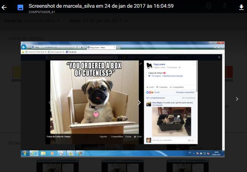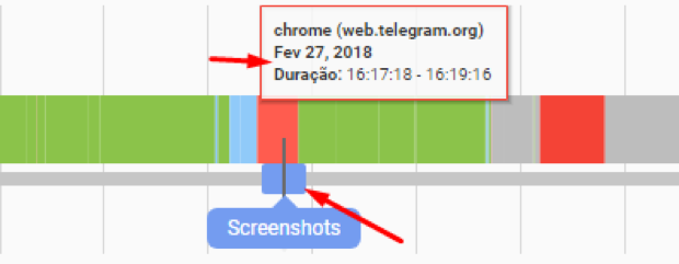 Uma importante funcionalidade existente no gráfico de linha do tempo é mostrar – por captura de tela-a tela exata de um computador monitorado em determinado momento do dia. É possível comprovar pela imagem da tela do computador monitorado o web site acessado ou aplicação utilizada evidenciada na timeline.