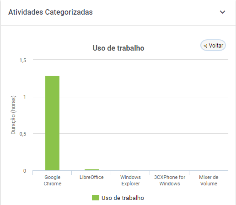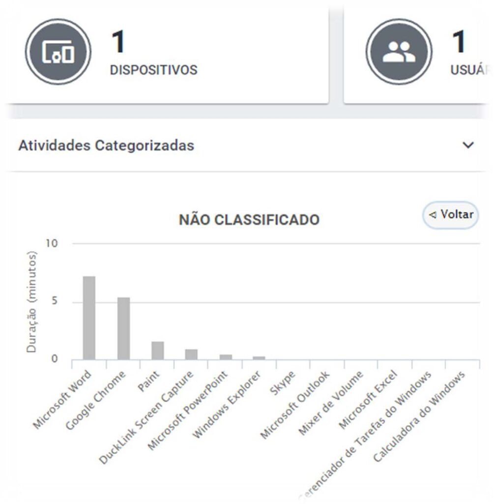 É possível detalhar as informações clicando sobre uma determinada categoria, que mostrará as aplicações utilizadas dentro desta categoria e o tempo de utilização de cada uma para aquele usuário em específico.