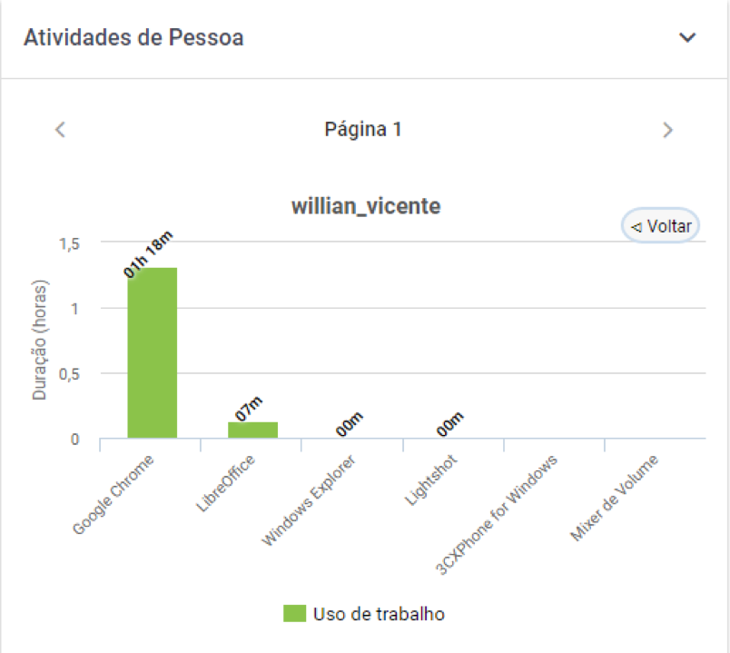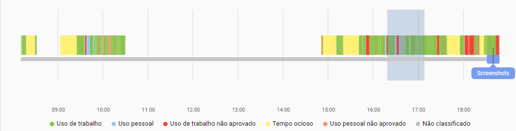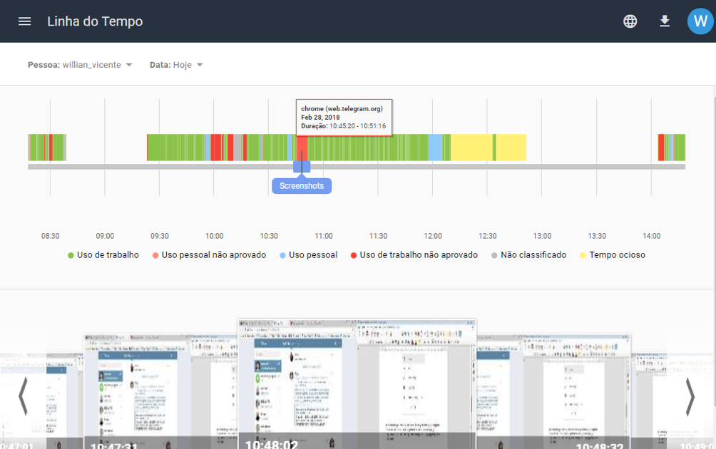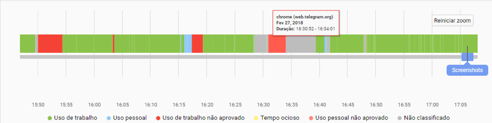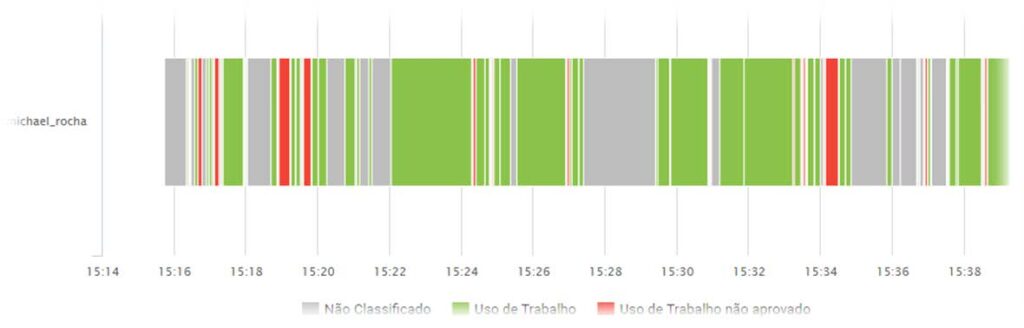O gráfico de linha do tempo permite analisar as ações de um determinado usuário monitorado durante todo o dia de trabalho. É possível verificar qual web site está sendo acessado ou qual aplicação está sendo utilização ao longo do dia. Também é possível filtrar o dia anterior ou outro dai específico.