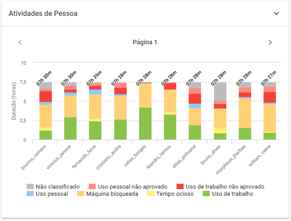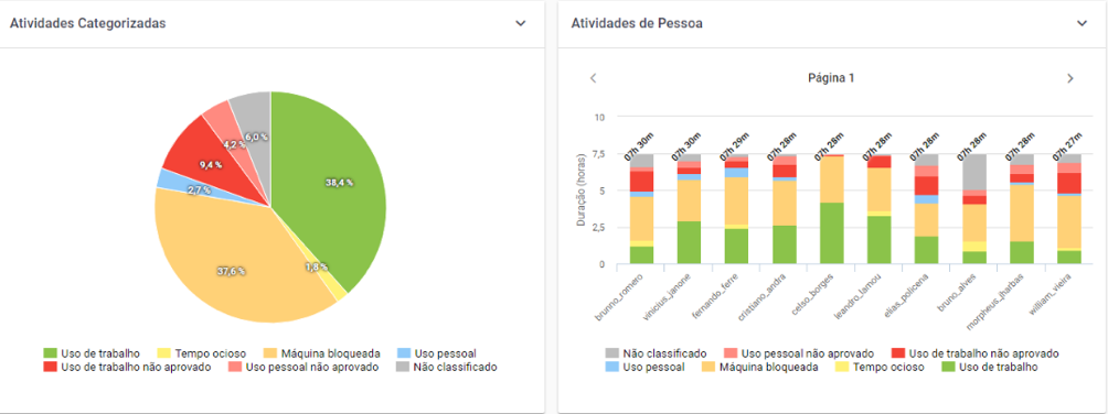 O dashboard possui insights valiosos, disponibilizados de forma simples, para que seja possível entender o comportamento da equipe e o que ocorre em cada computador monitorado associado à respectiva conta.