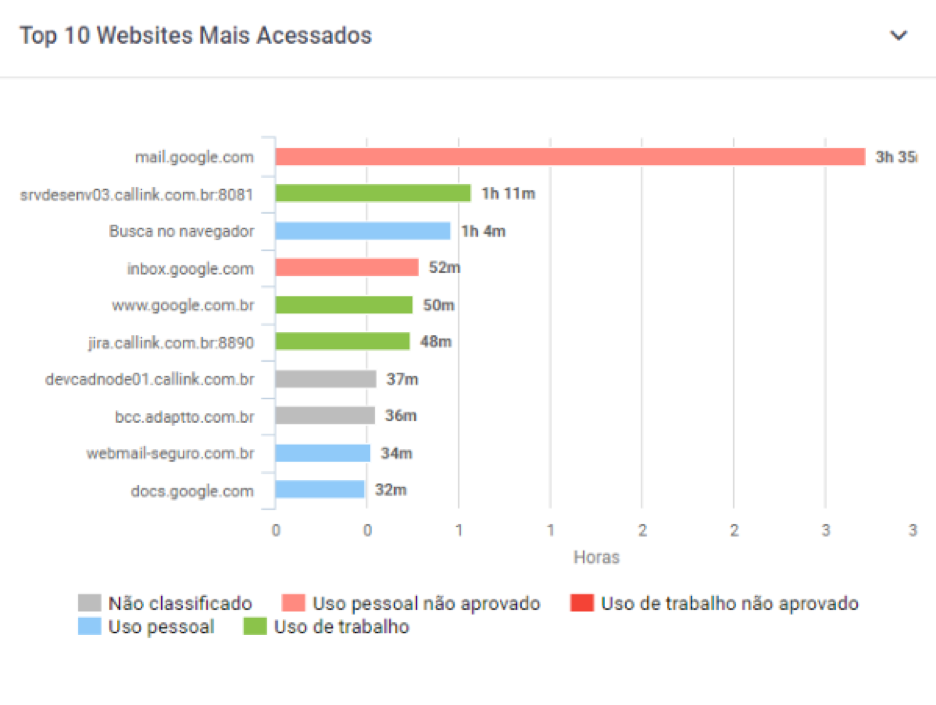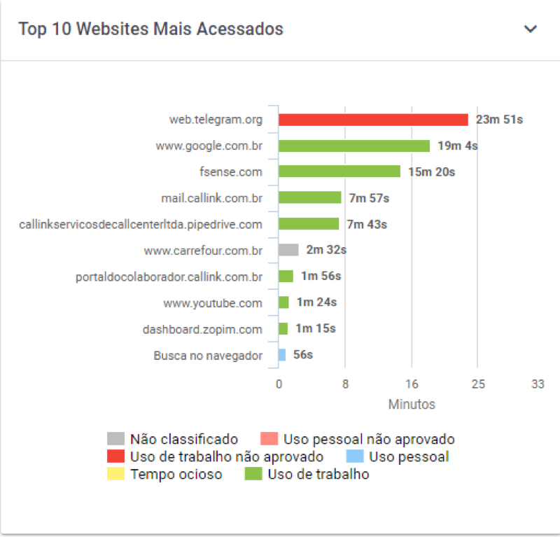 Este gráfico representa os web sites mais acessados e possuem a cor da categoria a que pertencem, sendo possível analisar também o tempo de acesso além de ser possível detalhar o acesso ao respectivo web site por usuário monitorado.