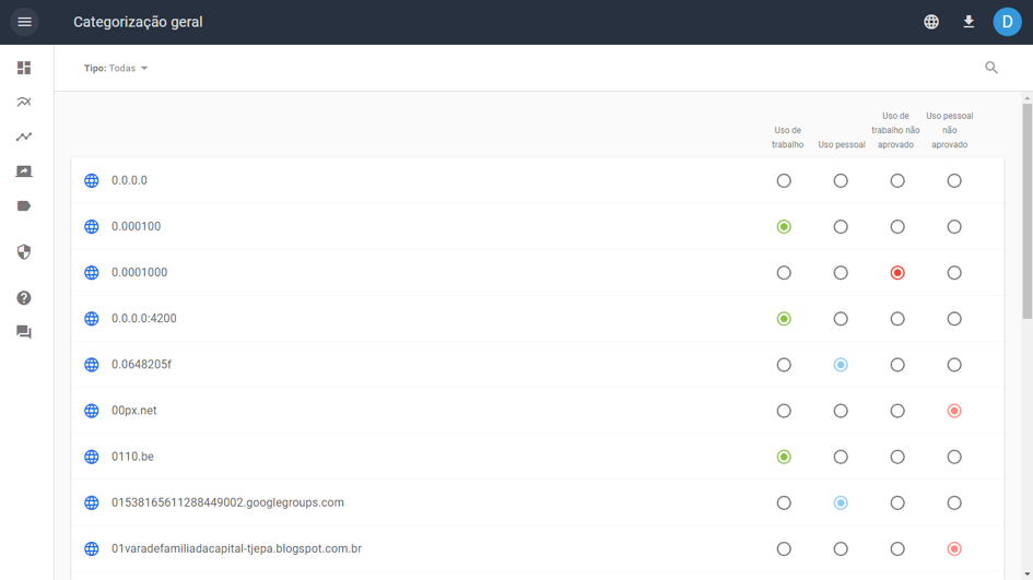 Ao acessar esta tela, podemos clicar na aba [Novas] para categorizar novas aplicações e web sites coletados ou, ainda, clicar na aba [Todos] para visualizar todas as aplicações e web sites categorizados ou, realizar uma nova categorização de uma aplicação ou web sites já categorizados anteriormente.