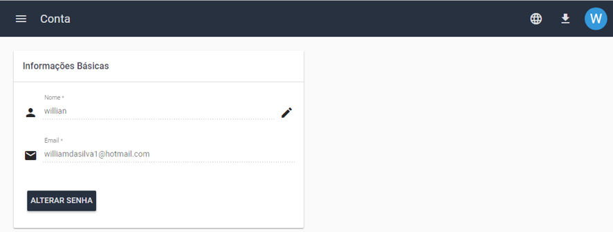 Ao clicar em ‘Meu perfil’ você terá acesso aos dados da conta, como Nome e e-mail. É possível alterar o nome ou a senha atual da conta.