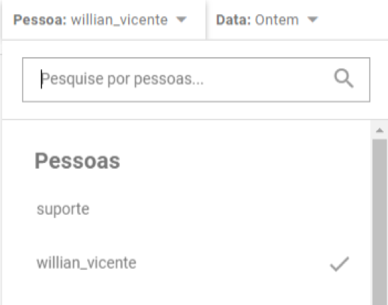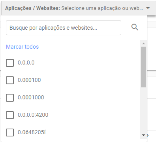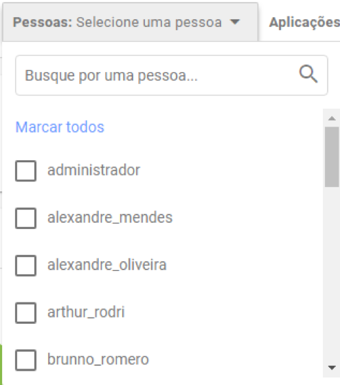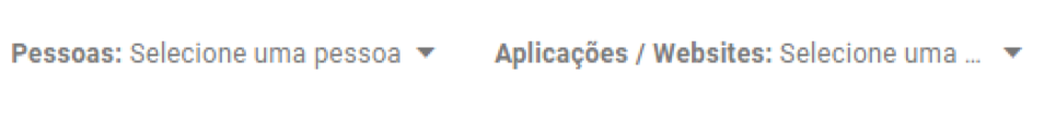 Por meio deste componente, é possível filtrar aplicações e usuários específicos. Obviamente, os filtros de período e aplicações/usuários podem ser utilizados simultaneamente para refinar os resultados e consequentemente os dados exibidos nos gráficos.