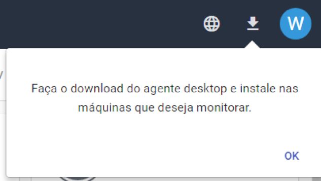 É necessário instalar o agente desktop nos computadores a serem monitorados para que os dados possam ser coletados. O usuário é guiado para que efetue tal ação.