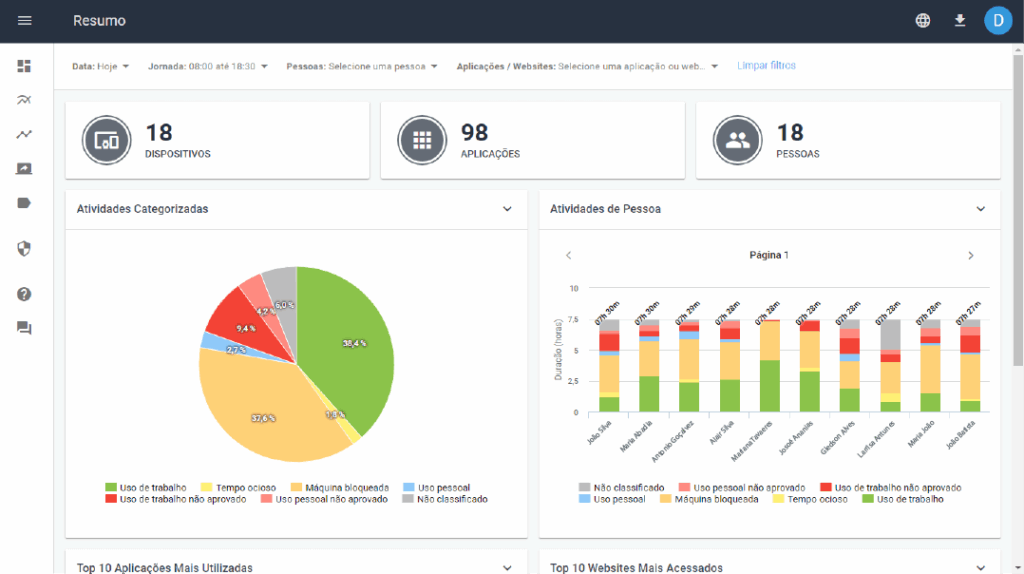O [Resumo] representa um dashboard com as informações pontuais do que ocorre nos computadores monitorados. Entretanto, é possível filtrar as informações utilizando os filtros de período e filtro de aplicações/usuários.