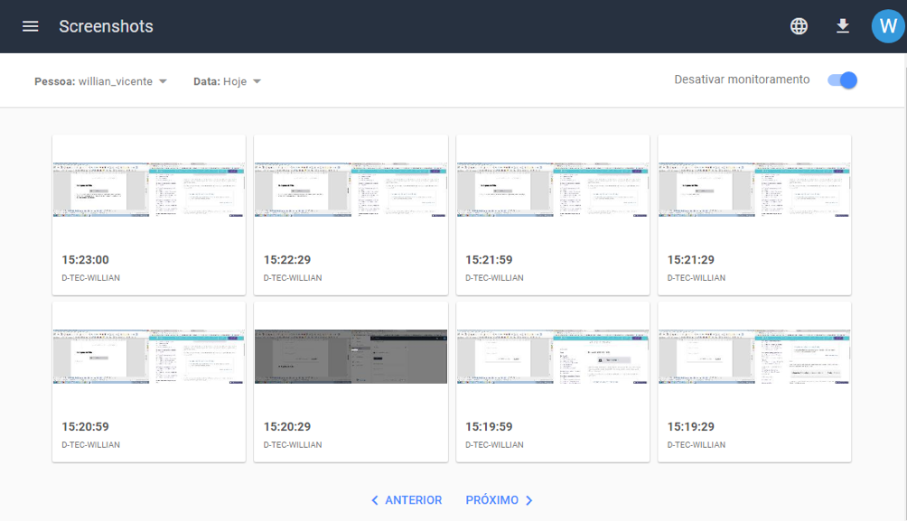 É possível selecionar uma data (dia) e usuário específicos para que seja possível visualizar as imagens capturadas da tela do computador deste usuário.
